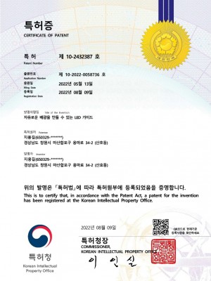 빛 공해방지용 안전가이드를 구비한 25W LED등기구 특허증